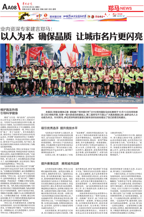“郑州银行杯”2019郑州国际马拉松赛将于10月13日在郑东新区CBD鸣枪开跑,在第一届大获成功的基础上,第二届郑马不止是让广大跑友翘首以盼,诸多业内人士也极为关注。针对郑马,多位资深专家在接受记者采访时也纷纷提出了自己的意见和建议。