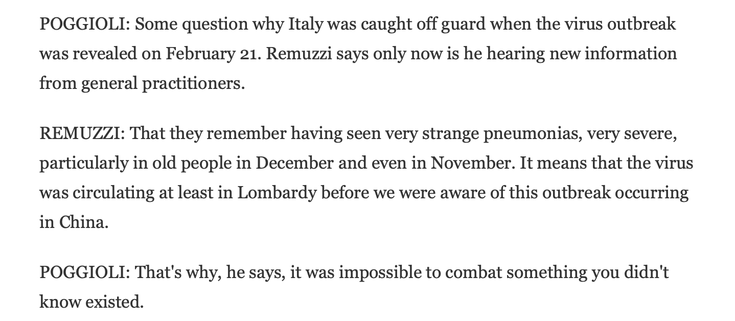 朱塞佩·雷穆齐:他们记得曾遇到过非常奇怪的肺炎,非常严重,尤其是12月甚至11月时在老人身上看到过这种肺炎。这意味着,至少在我们意识到疫情在中国暴发前,病毒就已经在伦巴第地区传播了。