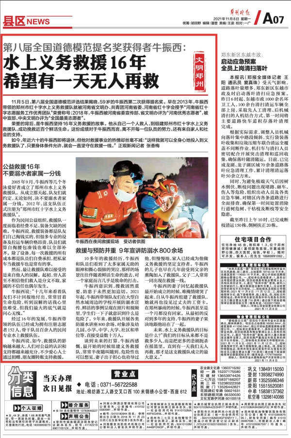 11月5日,第八届全国道德模范评选结果揭晓,59岁的牛振西第二次获得提名奖。义务救援16年,牛振西表示:只要身体条件允许,我就会一直坚守在救援一线。