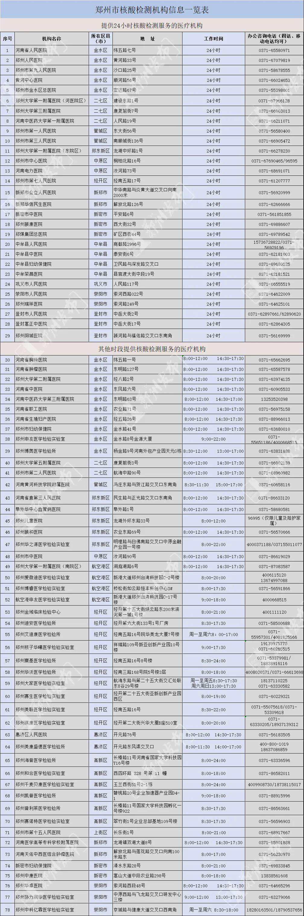 截至目前,郑州市共有78家机构具备核酸检测能力,全市29家综合性医疗机构面向市民提供24小时核酸检测服务。若需获取更多信息请登录“郑好办”APP-疫情服务-核酸检测点查询(含电子地图标识)。具体名单如下↓