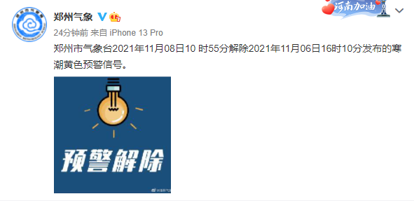 郑州市气象台2021年11月08日10时55分解除2021年11月06日16时10分发布的寒潮黄色预警信号。