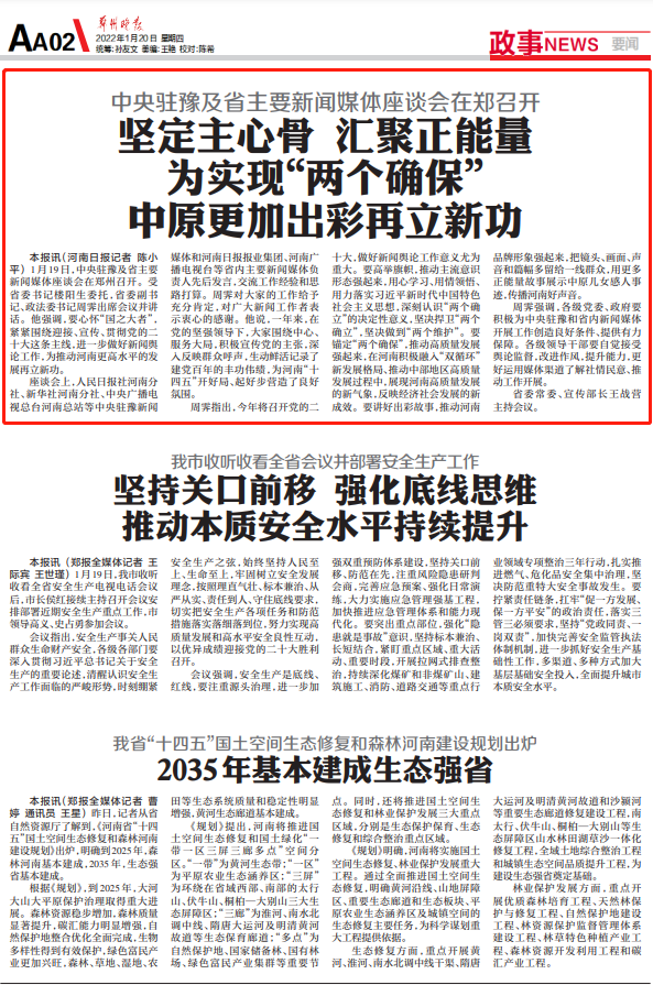1月19日,中央驻豫及省主要新闻媒体座谈会在郑州召开。受省委书记楼阳生委托,省委副书记、政法委书记周霁出席会议并讲话。他强调,要心怀“国之大者”,紧紧围绕迎接、宣传、贯彻党的二十大这条主线,进一步做好新闻舆论工作,为推动河南更高水平的发展再立新功。