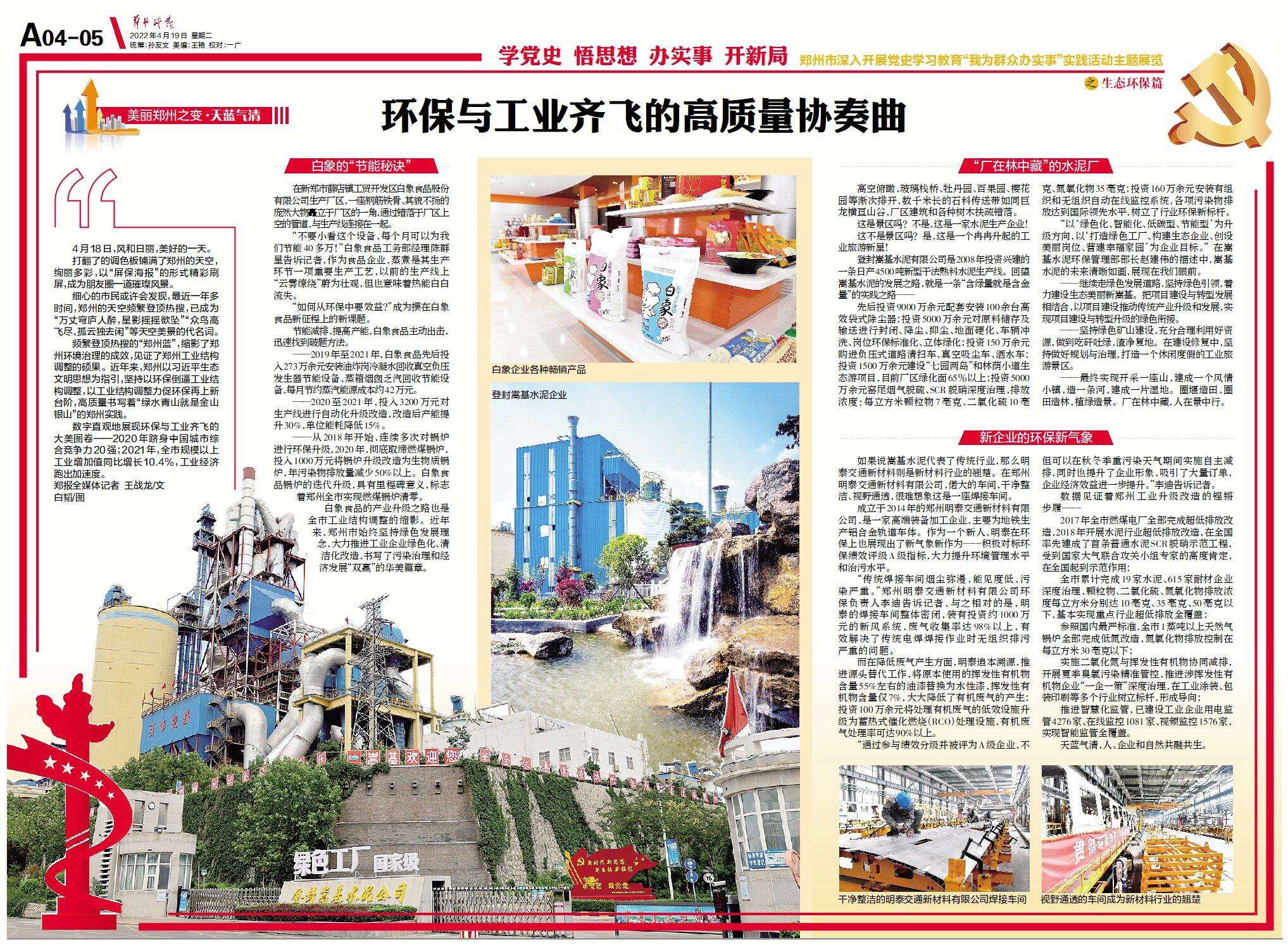白象食品的产业升级之路也是全市工业结构调整的缩影。近年来,郑州市始终坚持绿色发展理念,大力推进工业企业绿色化、清洁化改造,书写了污染治理和经济发展“双赢”的华美篇章。