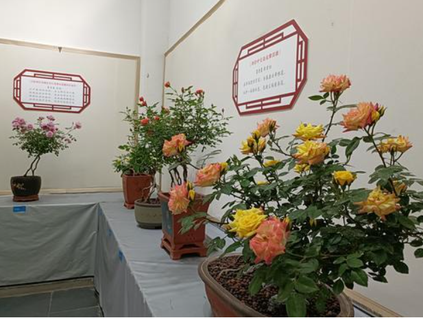 植物园盆景园前厅集中展示园林系统选送的49盆精品月季盆景,体现盆景制作的精湛技艺。