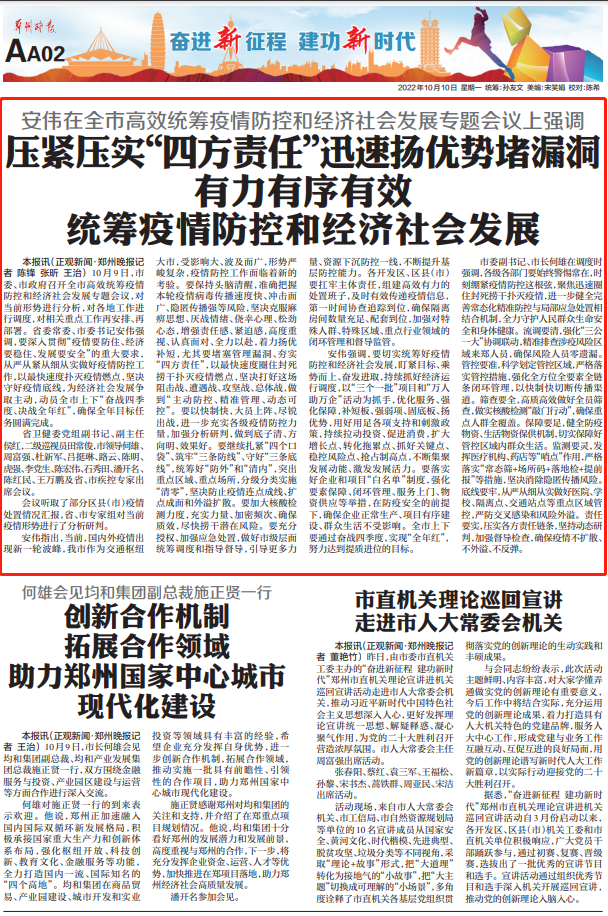 市委副书记、市长何雄在调度时强调,各级各部门要始终警惕常在,时刻绷紧疫情防控这根弦,聚焦迅速圈住封死捞干扑灭疫情,进一步健全完善常态化精准防控与局部应急处置相结合机制,全力守护人民群众生命安全和身体健康。流调要清,强化“三公一大”协调联动,精准排查涉疫风险区域来郑人员,确保风险人员零遗漏。管控要准,科学划定管控区域,严格落实管控措施,强化全方位全要素全链条闭环管理,以快制快切断传播渠道。筛查要全,高质高效做好全员筛查,做实核酸检测“敲门行动”,确保重点人群全覆盖。保障要足,健全防疫物资、生活物资保供机制,切实保障好管控区域内群众生活。监测要灵,发挥医疗机构、药店等“哨点”作用,严格落实“常态筛+场所码+落地检+提前报”等措施,坚决消除隐匿传播风险。底线要牢,从严从细从实做好医院、学校、隔离点、交通站点等重点区域管控,严防交叉感染和风险外溢。责任要实,压实各方责任链条,坚持动态研判,加强督导检查,确保疫情不扩散、不外溢、不反弹。
