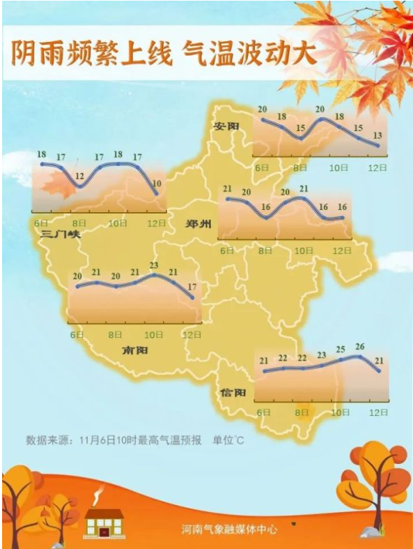预计今天夜间起,全省阴雨将频繁登场,主要集中在西部西北部,以弱降水为主。阴雨的上线也导致气温的波动,预计未来一周,除了南部地区以外,其他大部地区气温波动较大,比如郑州,未来五天的最高气温基本在17℃-20℃之间上下波动。一场秋雨一场寒,添衣、加被,顺问冬安!