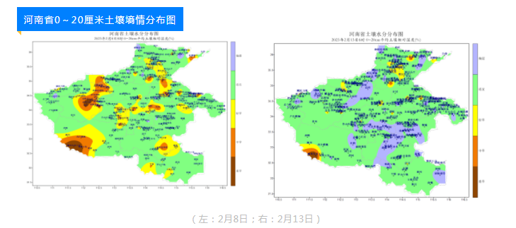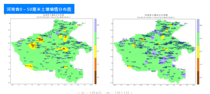 两次雨雪过程有效改善了土壤墒情,对冬小麦返青起身,巩固冬前分蘖成穗,预防早春冻害非常有利。据2月13日6时自动土壤水分监测站网数据显示,当前全省大部地区表墒适宜、底墒充足,0~20厘米缺墒测站比例已降至17%,较降水前减少16%;0~50厘米缺墒测站比例已降至10%,较降水前减少了7%。此外,雨雪过后全省森林火险等级明显下降,空气质量明显好转。