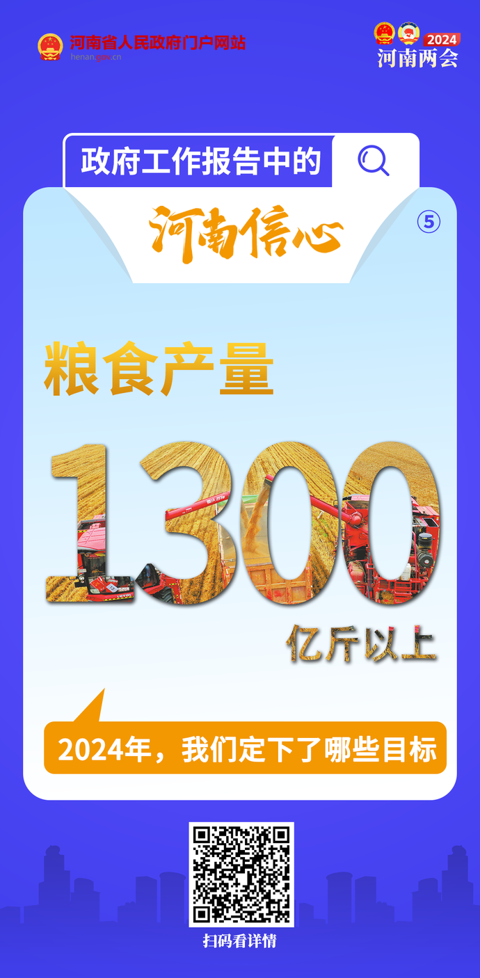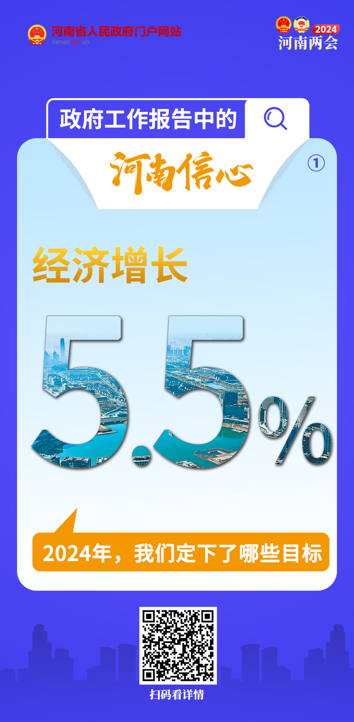 政府工作报告中提出,2024年主要预期目标是:经济增长5.5%,研发经费投入强度2.1%,规上工业增加值增长6.5%,固定资产投资增长7%,社会消费品零售总额增长7%,进出口平稳增长,一般公共预算收入增长5%,城镇调查失业率5.5%左右,城镇新增就业110万人以上,居民消费价格涨幅3%左右,居民收入增长和经济增长同步,粮食产量1300亿斤以上,单位生产总值能耗下降3%以上。