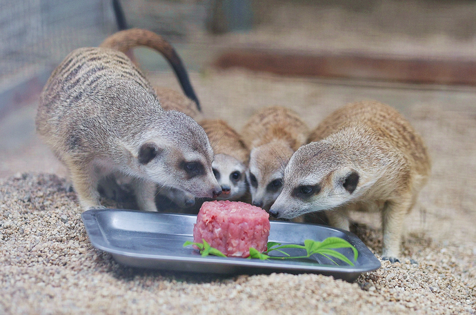 细尾獴一家五口看到饲养员刚放进去的一大盘“月饼”,便一哄而上,争先恐后地吃了起来,其中一只獴宝还躲到旁边吃,生怕有人跟它抢。