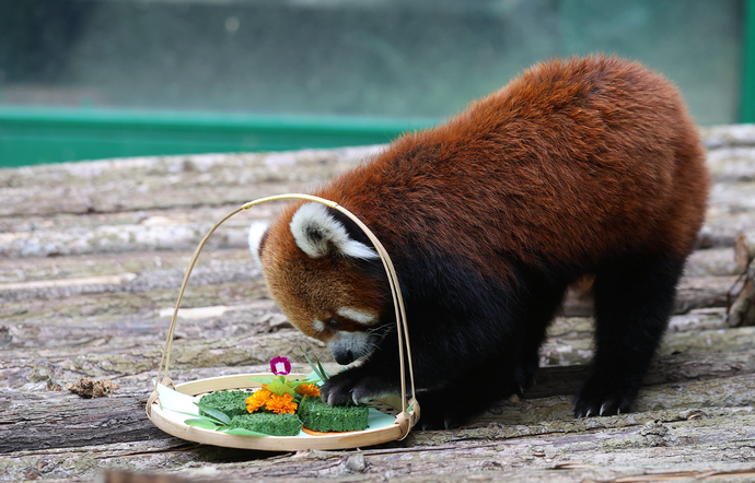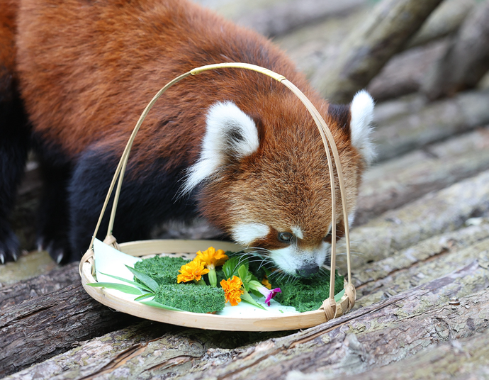 第一次吃“月饼”的小熊猫非常谨慎,工作人员就把它们平时吃的竹叶打碎,加入奶粉,做成了奶香竹叶“月饼”。但小熊猫刚开始只是闻了闻,并不肯吃,等到它们在饲养员的引导下尝了一口后,便立刻开启了狂炫模式。