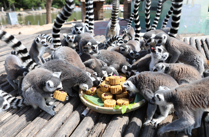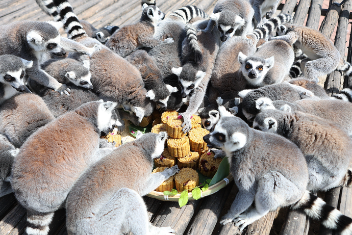 面对色香味俱全的“月饼”,动物们的食欲一下子被调动起来。最馋的当属环尾狐猴,红枣核桃“月饼”刚一端上来,它们就呼啦一下全围了上去,抱起一整块大口小口地啃了起来。个别手慢没抢到的也不甘心,趁哪只专注啃月饼不注意便“噌”地一下抢了去。