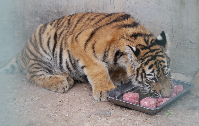 豫式鲜肉“月饼”造型简洁、馅料单一,很对食肉动物的胃口。喝奶长大的小老虎团子虽然是第一次吃“月饼”,但眨眼工夫就把一盘干光了,并意犹未尽地舔起了盘子。
