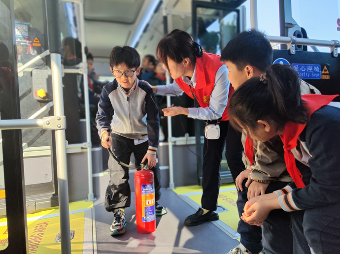 活动进行中,志愿者们循序渐进地为孩子们介绍了公交车上的灭火器、安全锤以及紧急逃生通道的具体位置,并逐一阐述了它们在紧急情况下的重要作用以及正确使用方法。