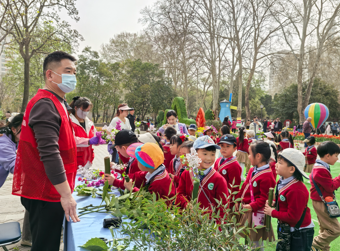 郁金香花展开幕当天,市人民公园还举办了“郁见春光 童趣盎然”自然科普课堂,邀请221名儿童参与“郁见春光?童心手绘”“樱花地绘”“郁金香盆栽制作”“郁樱有声科普”“春日游园”等活动,让孩子们在亲近自然的过程中感知生命之美,在动手实践中树立生态文明意识。