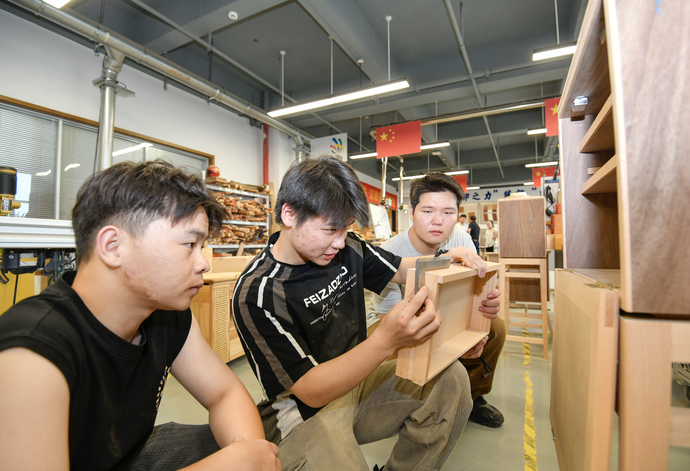 在家具制作赛项训练场地,参赛选手正低头专注练习。“这个赛项更加注重动手能力,在备赛前期,我们组织二三十个学生来到这里集训,动手制作,发现自己的优势与不足,从学生中间优中选优,确定参加比赛的人选。”家具制作赛项的指导老师邓兆伦参加过前两届全国技能大赛,取得第一届全国职业技能大赛第五名、第二届全国职业技能大赛铜牌、全国技术能手荣誉称号的好成绩后留校任教。“学校一向对技能人才非常重视,希望广揽贤才,为学校坚持科创引领办学模式提供新动力。”邓兆伦说。