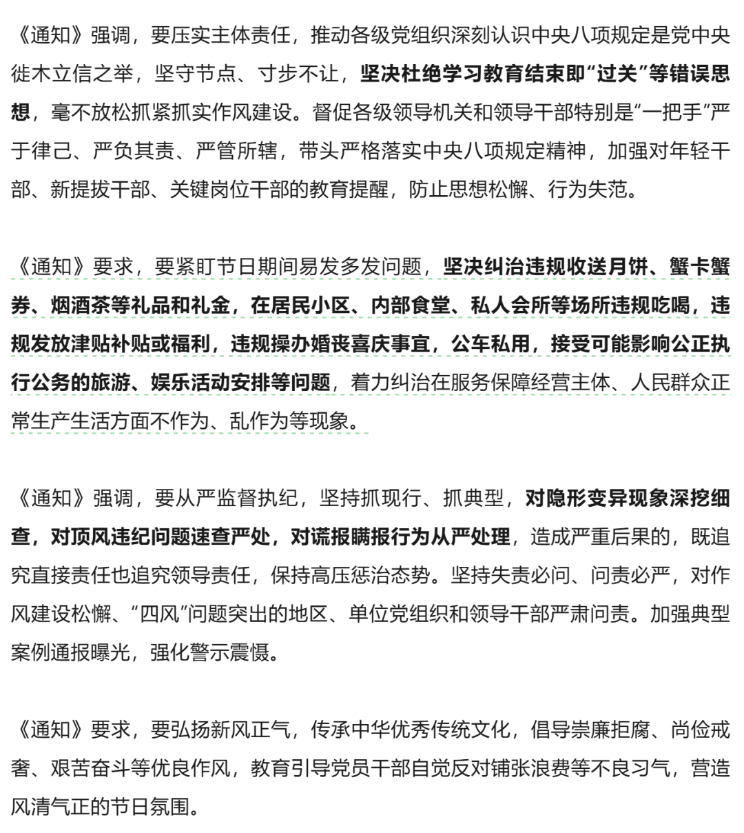 据中央纪委国家监委网站9月27日消息,国庆、中秋将至,为巩固拓展深入贯彻中央八项规定精神学习教育成果,中央纪委办公厅日前印发《关于国庆中秋期间严格落实中央八项规定精神、从严纠治“四风”的通知》,要求各级纪检监察机关加强监督检查,坚决防止“四风”反弹回潮。