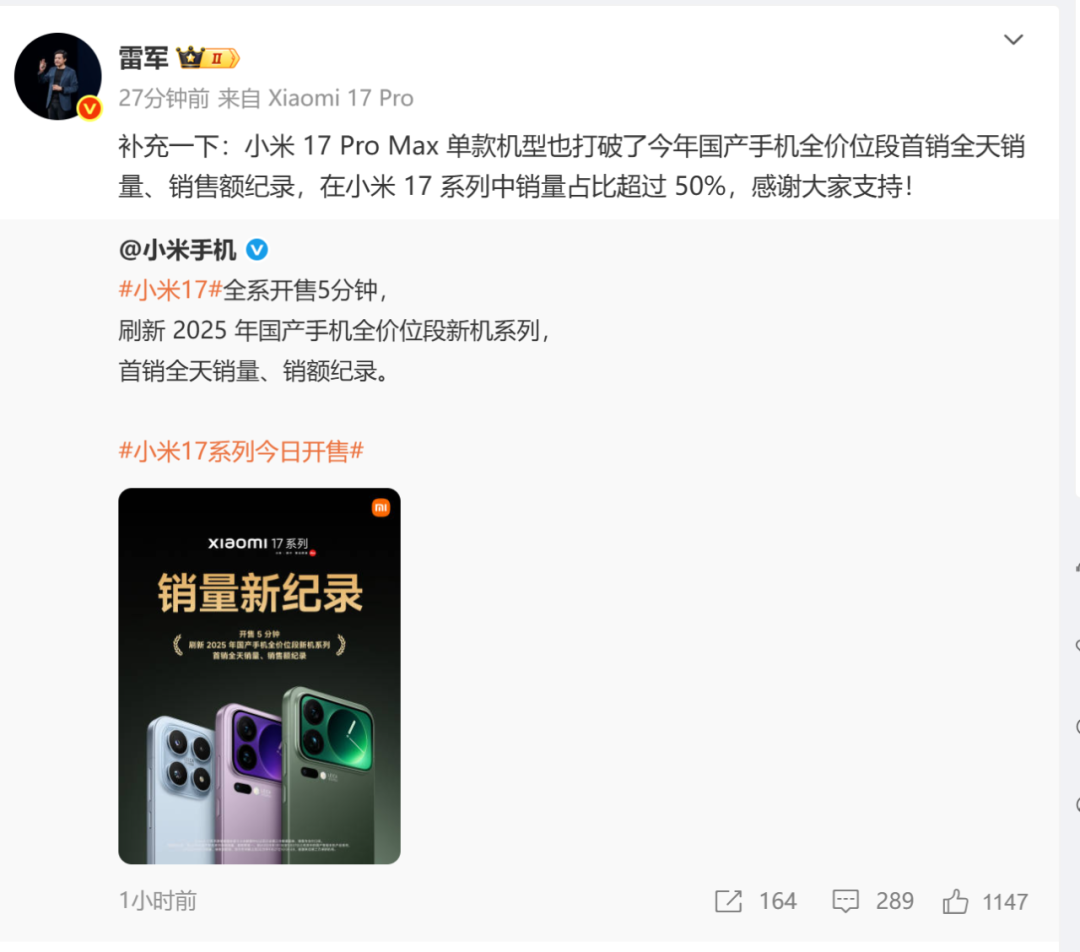 随后小米集团董事长兼CEO雷军表示,小米17 ProMax单款机型打破了今年国产手机全价位段首销全天销量、销售额纪录,在小米17系列中销量占比超过50%。