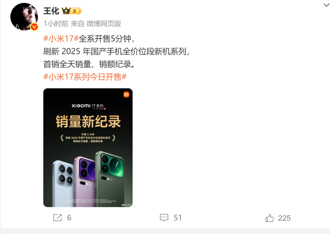 9月27日上午10时12分,小米集团公关部总经理王化在微博上公开表示,小米17全系开售5分钟,刷新2025年国产手机全价位段新机系列的首销全天销量、销额纪录。