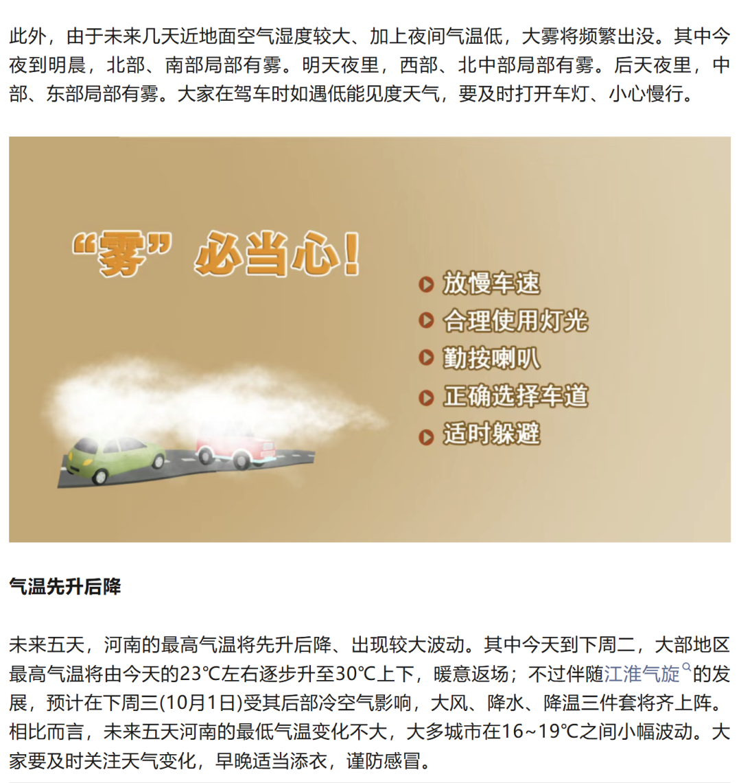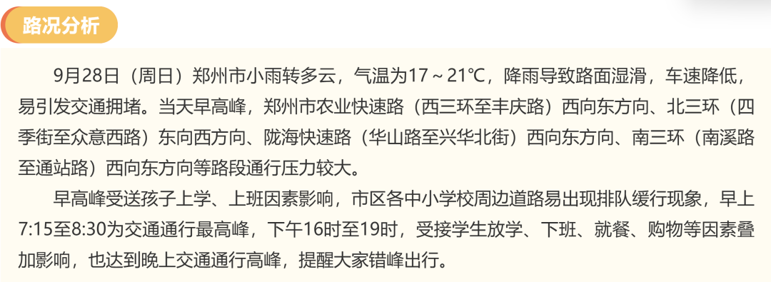 根据国庆中秋双节放假安排,9月28日(周日)正常上班,受降雨、上学、上班以及节前探亲访友、购物、聚餐等因素影响,早晚高峰期郑州市区将出现较大车流量。郑州交警提醒您提前关注路况信息,合理规划出行计划,避免因车流量大给您的出行带来不便。