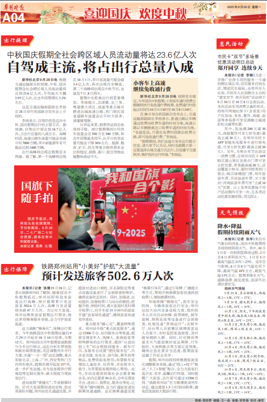 运力调配“精准化”,保障出行需求。今年铁路国庆中秋假期运输自9月29日开始至10月10日结束,为期12天。郑州站结合历年假期客流数据与今年出行特点,动态分析车票预售和候补购票数据,灵活调整列车开行方案,实施“一日一图”动态调整,重点加密北京、上海、广州、西安等热门方向列车班次,假期共增开临客157列,进一步扩充运能,并为旅客提供行程规划等定制化服务,最大限度方便旅客出行。