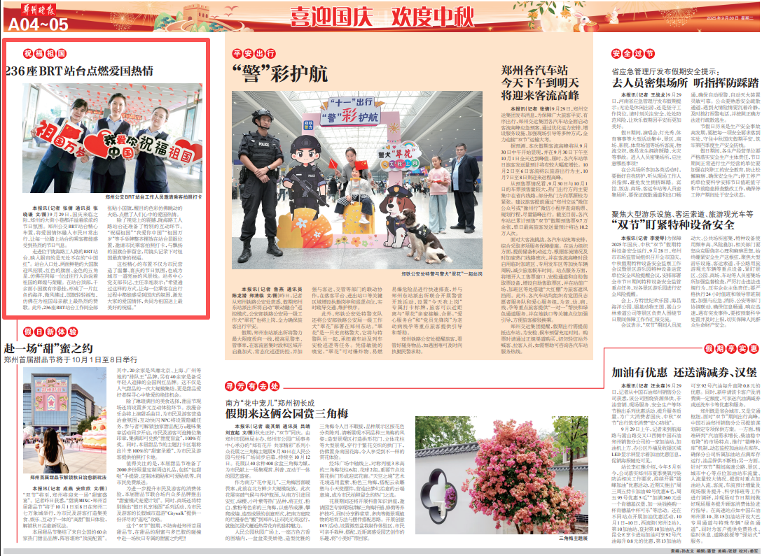 9月29日,国庆来临之际,郑州的大街小巷都洋溢着浓浓的节日氛围。郑州公交BRT站台精心布置,将爱国情怀融入市民日常出行,让每一位踏上站台的乘客都能感受到热烈的节日气息。