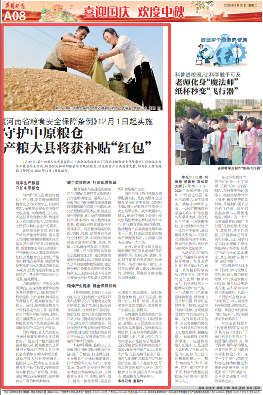 9月29日,省十四届人大常委会第二十次会议表决通过了《河南省粮食安全保障条例》(以下称为《条例》),以法治之力筑牢粮食安全防线,提高防范和抵御粮食安全风险能力,促进粮食产业高质量发展,助力农业强省建设。《条例》自2025年12月1日起施行。