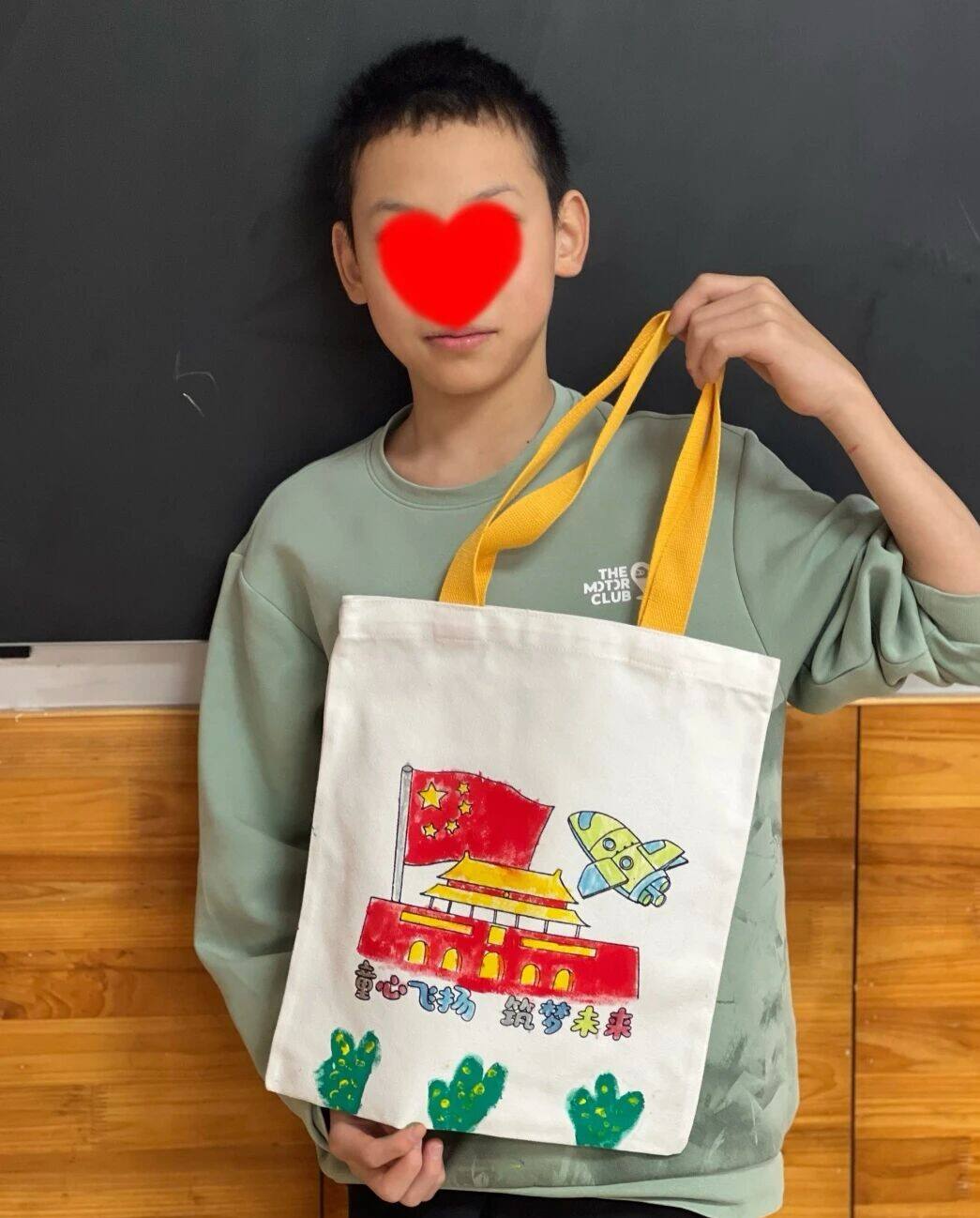 “老师看我的好看吗?”“老师老师看我的……”不一会儿,一个个色彩斑斓、充满童真与爱国情怀的创意帆布包便陆续完成。孩子们骄傲地展示着自己的作品,脸上洋溢着自豪与喜悦的笑容。这些独一无二的手工作品,不仅承载着孩子们对中秋团圆的美好期盼,更寄托了对祖国生日最纯真的祝福。