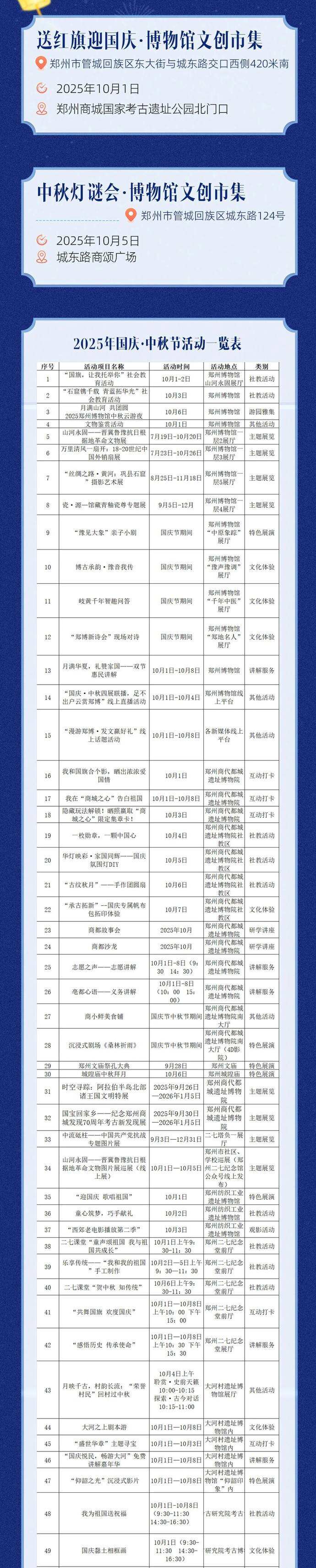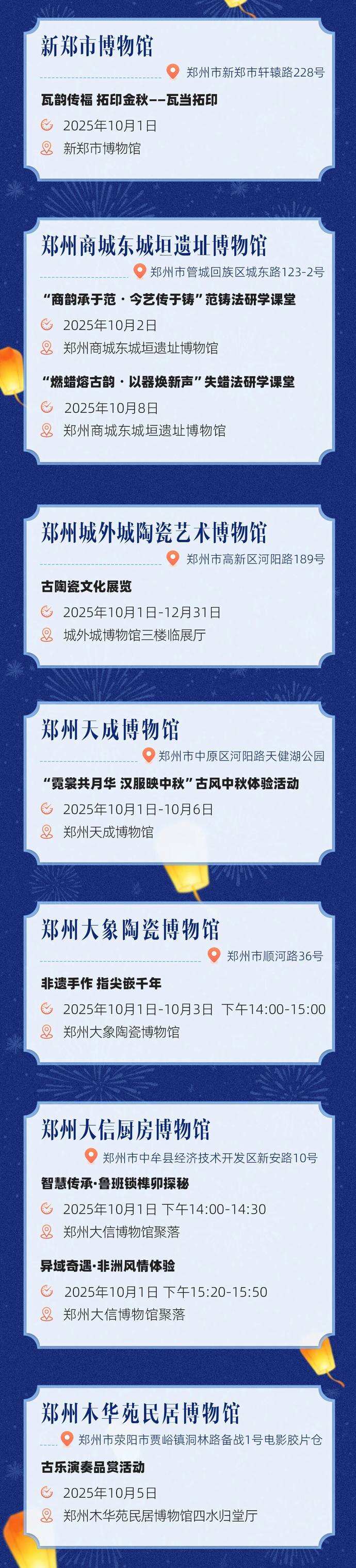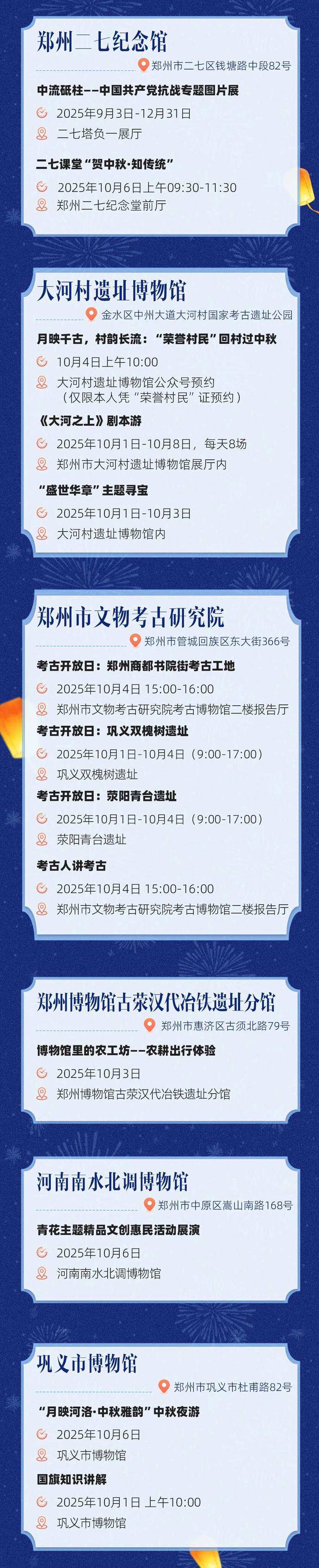 博物馆奇妙夜继续进行。10月6日晚,郑州博物馆开展“月满山河 共团圆”2025中秋云游夜活动,预计人数达3000人。郑州商代都城遗址博物院开展城隍庙里赏佳月活动。巩义市博物馆“宋宴映月?礼溯千年”雅宴等。郑州市文物局还将开展“今宵月郑圆”线上直播活动,传承节日文化,打造城市记忆。