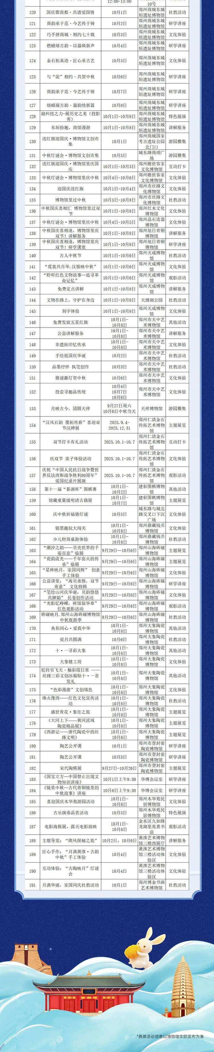 记者从郑州市文物局获悉,为切实满足市民群众的节日文化需求,充分展现郑州作为“商都文化之城”的独特魅力,今年中秋国庆假期,郑州市文物局以“郑是金秋 月满商都”为主题,精心策划了10类191项多彩纷呈的活动,为广大市民群众呈现丰富多彩的节日文化盛宴。