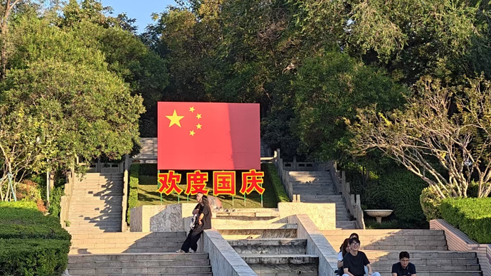西门、北门还悬挂了鲜红的国旗,西园摆放了巨幅国旗及“祖国繁荣昌盛”“欢度国庆”大字,并对公园西门口主景点、西园巨幅国旗及北门口进行了灯光亮化,营造出静谧浪漫的节日夜景。