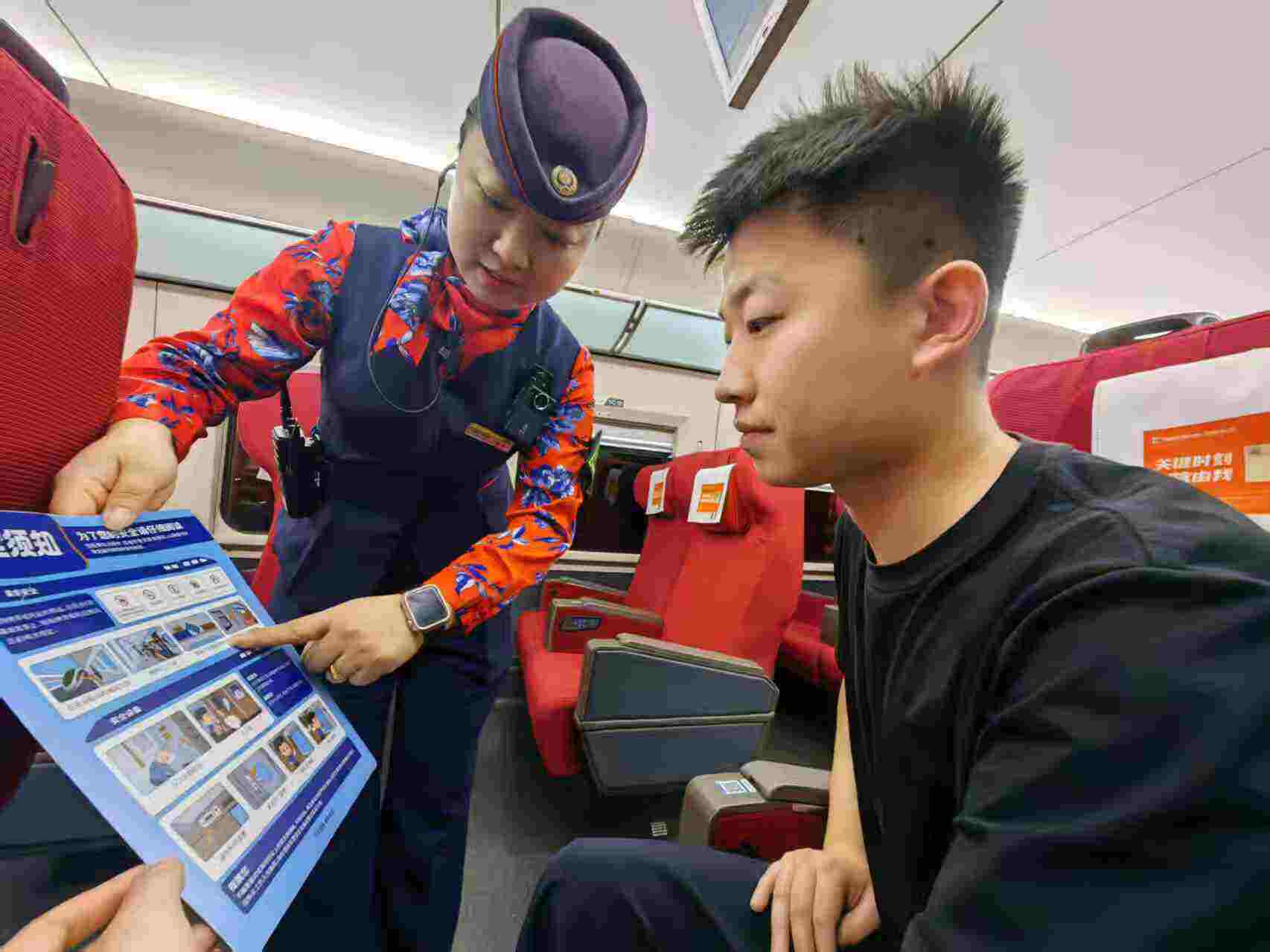 “夜高铁旅客疲劳困倦容易越站,列车开启提醒服务,提醒下车旅客带好行李物品不要遗忘在列车上。乘务员按规定巡视车厢,摆放行李,我们用严肃、严格、严谨实干精神,服务标准和白天一个样,标准不降低。”1日昆明5组担当的G4242次列车长杨雪说。