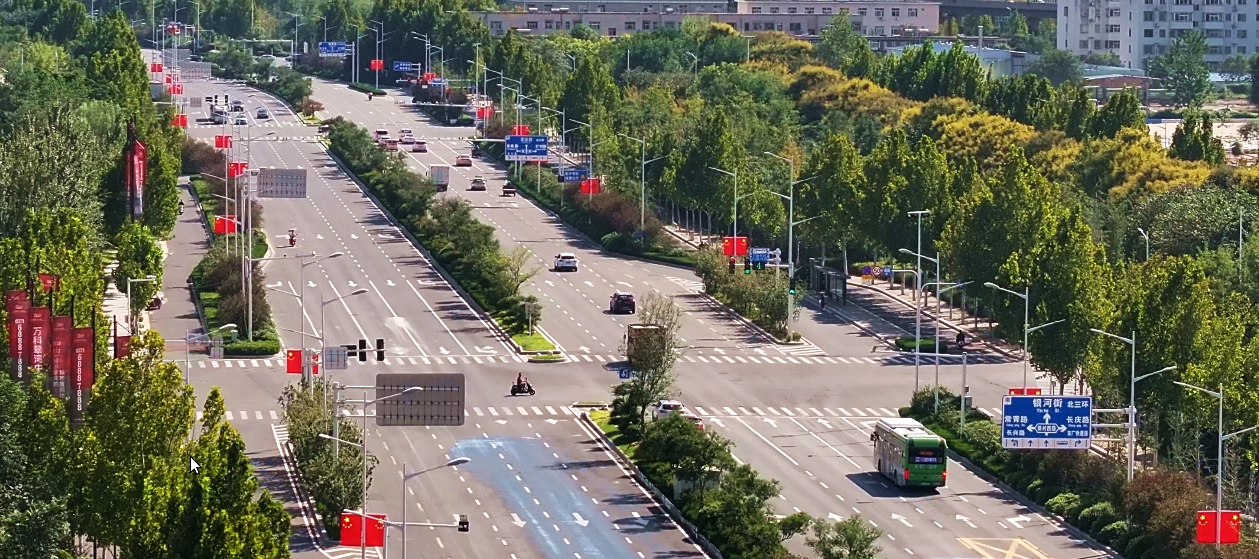 中原路上,整齐的国旗与两旁的绿植花卉相映成炬,铺就出一条充满生机与喜庆的红色长廊。