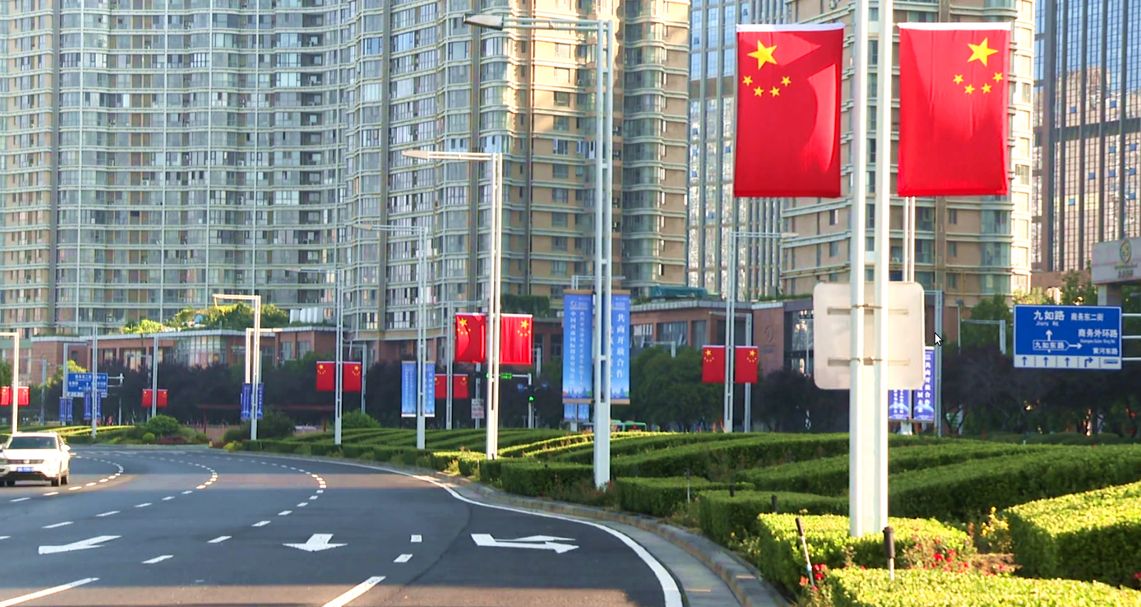 千面国旗沿着中州大道绵延开来,宛如赤色绸缎铺展城市动脉。