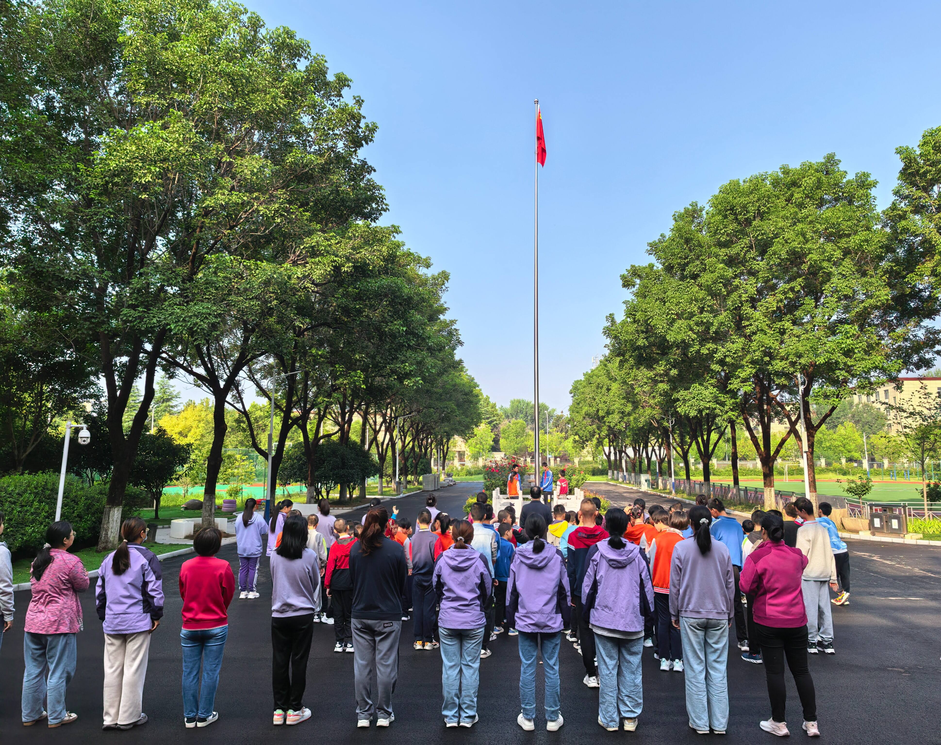 活动当天,在雄壮的国歌声中,五星红旗冉冉升起。全体师生庄严肃立,孩子们仰望着国旗,眼神中充满自豪与崇敬。升旗仪式后,杨老师以《家国团圆,同心筑梦》为题发表演讲,将家国同心的种子播撒进每个孩子的心田。随后,孩子们精神饱满地朗诵了诗歌《我的祖国》,稚嫩却坚定的嗓音表达了对祖国母亲最真挚的爱意。