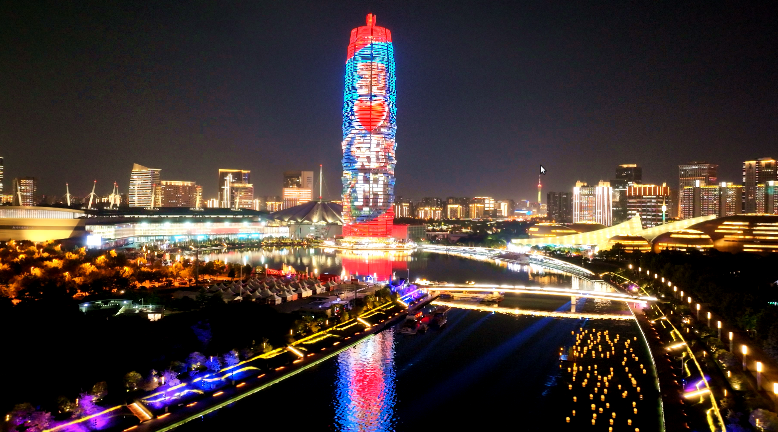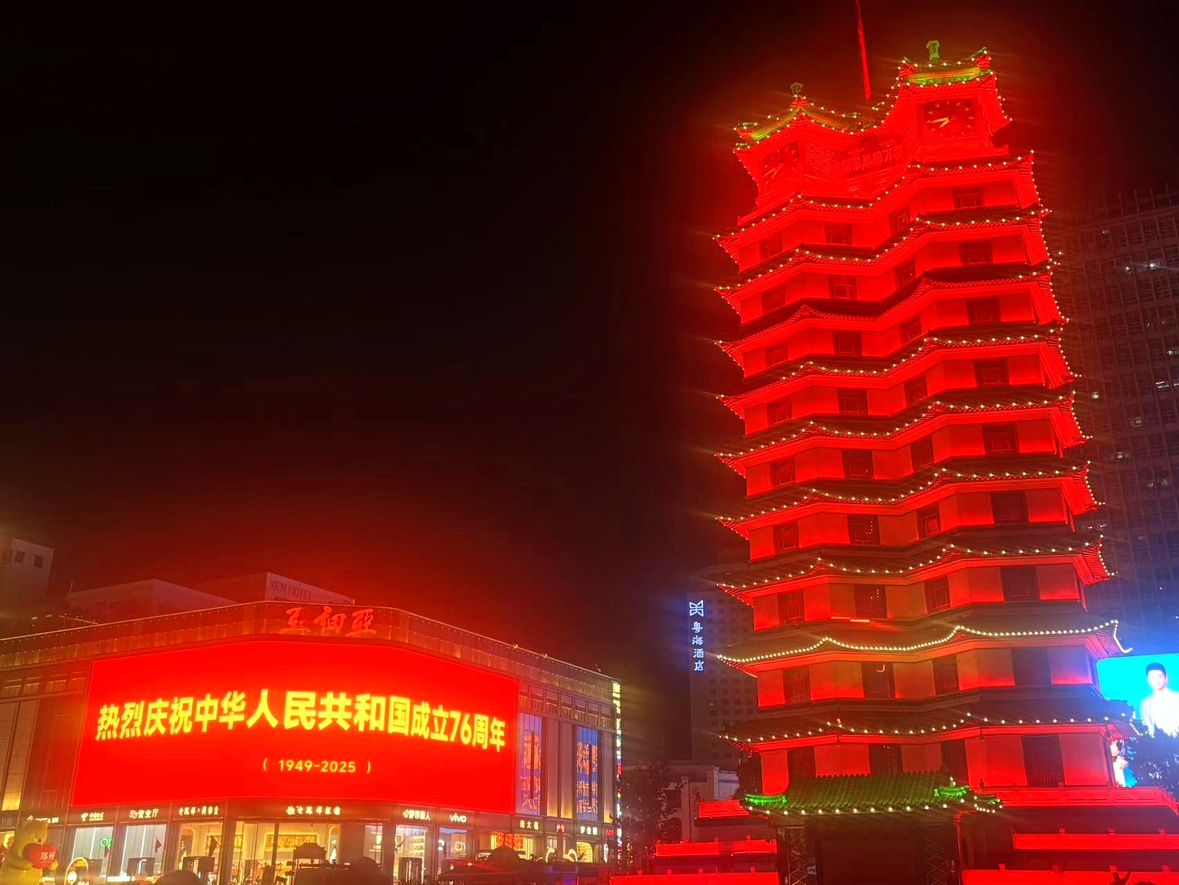 千玺广场玉米楼,夜幕降临后,这座标志性建筑化身巨型“光影画布”,“庆祝中华人民共和国成立76周年”“我爱中国”等爱国标语以动态光影形式循环播放,与周边璀璨的城市夜景融为一体,吸引众多市民驻足观赏、拍照留念。