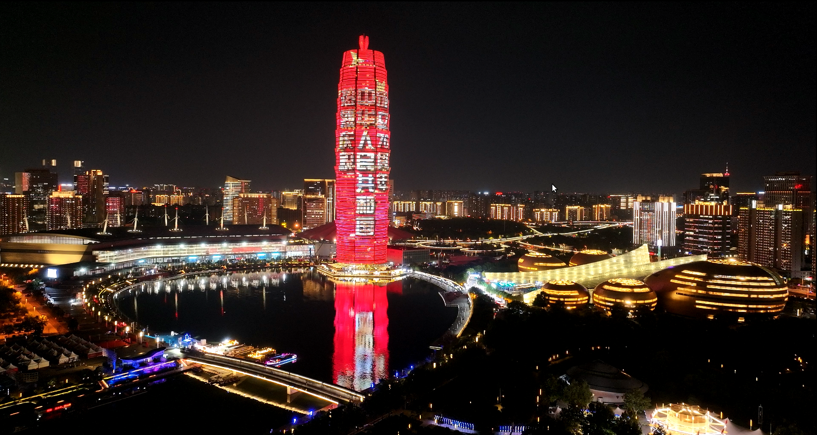 郑州二七塔,夜幕下的这座红色地标更显雄伟庄重。爱国标语与二七塔的历史建筑融合,仿佛在诉说着峥嵘岁月与新时代的荣光,浓厚的家国情怀在这一刻愈发炽热。