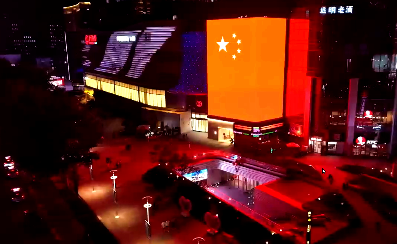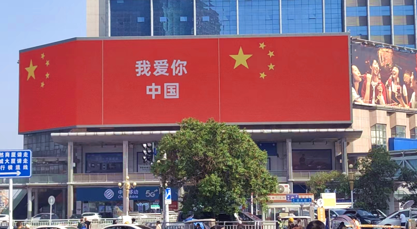 在各商圈,华灯初上后爱国元素更显璀璨,市民们或驻足观赏大屏画面,或与灯光下的国旗合影,商圈的热闹烟火气与炽热的爱国情怀在夜色中完美交融。