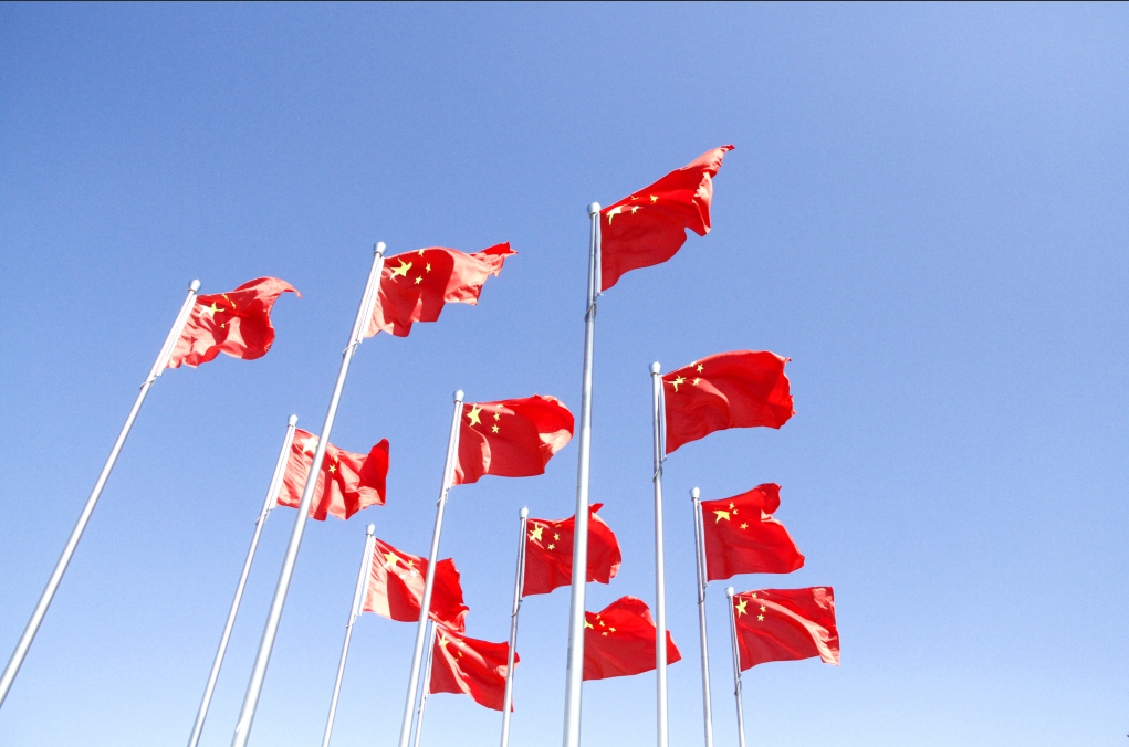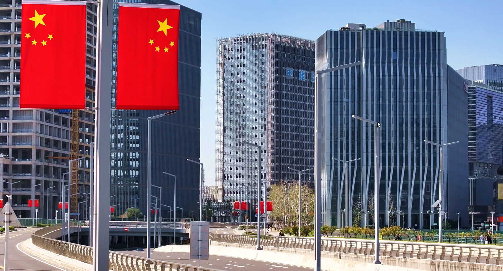 奥体中心国旗迎风招展,流动的红色长河映照盛世荣光。