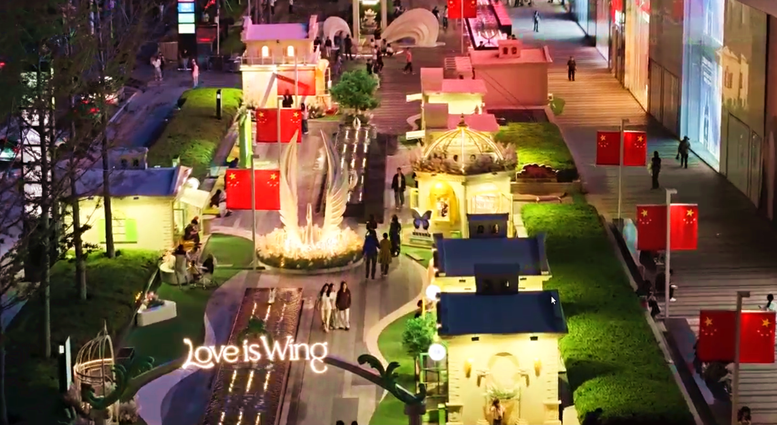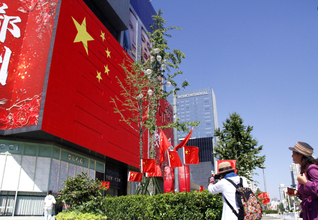 行人穿梭商圈之间,举起手机定格国旗,浓厚的国庆氛围扑面而来。