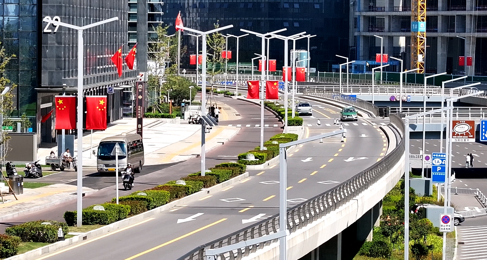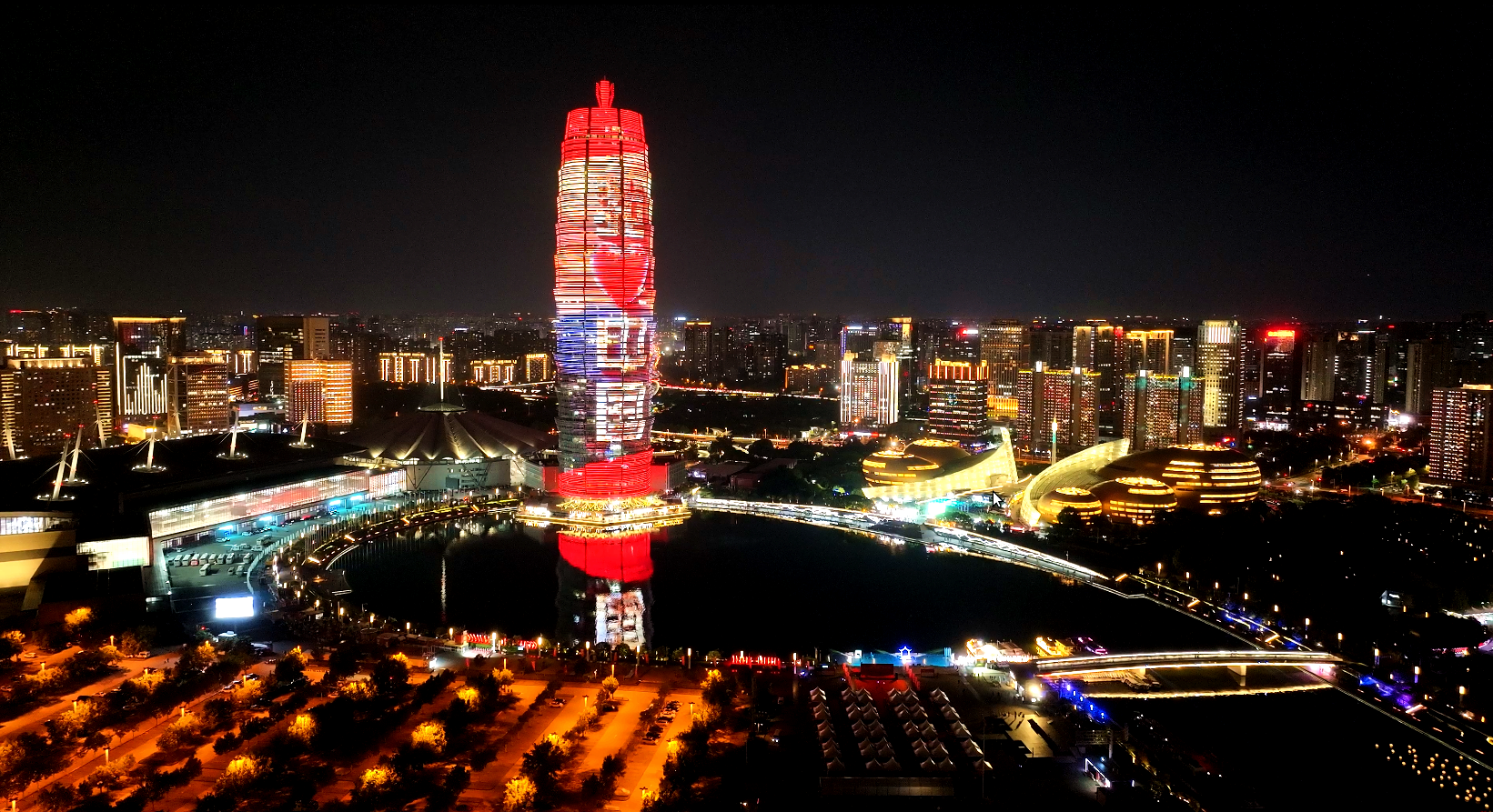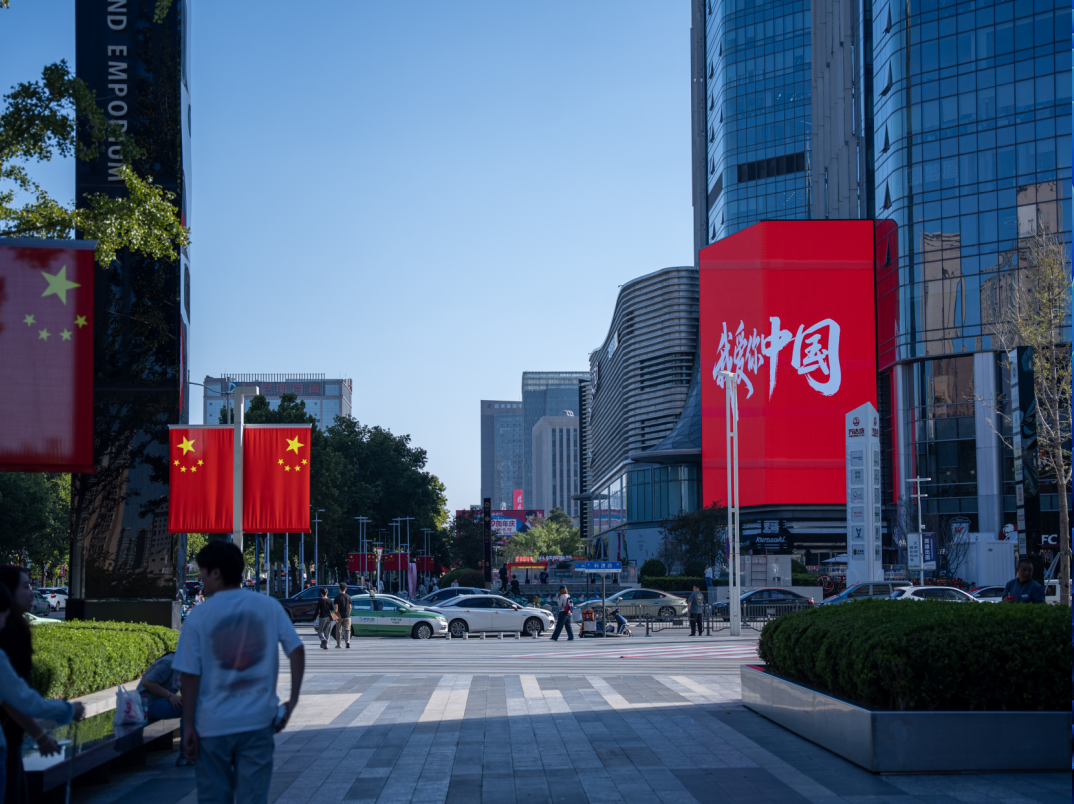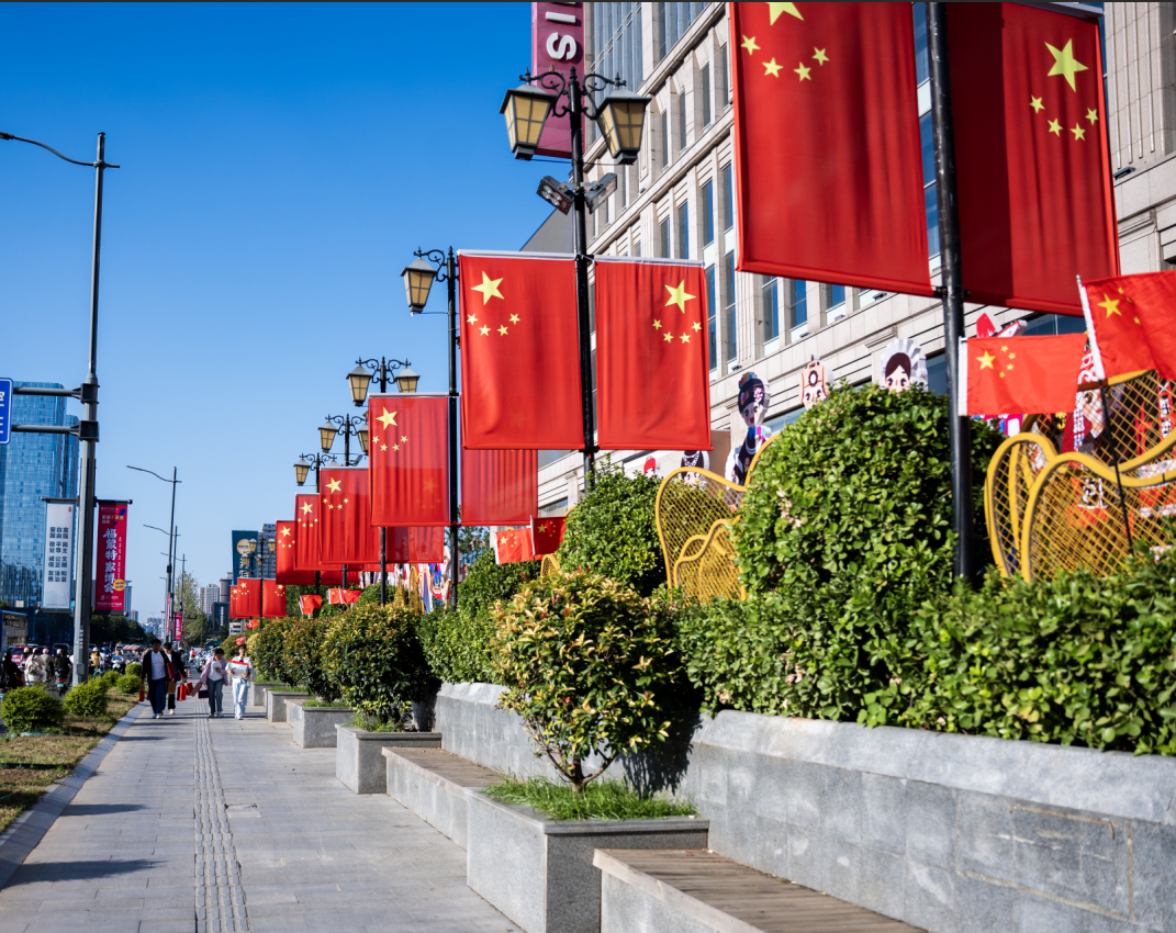 郑州金融岛,一面面五星红旗迎风招展,前来购物、休闲的市民穿梭其间,既能感受到商圈的活力,又能被浓厚的爱国氛围所感染,节日的喜悦在温馨的互动中悄然传递。