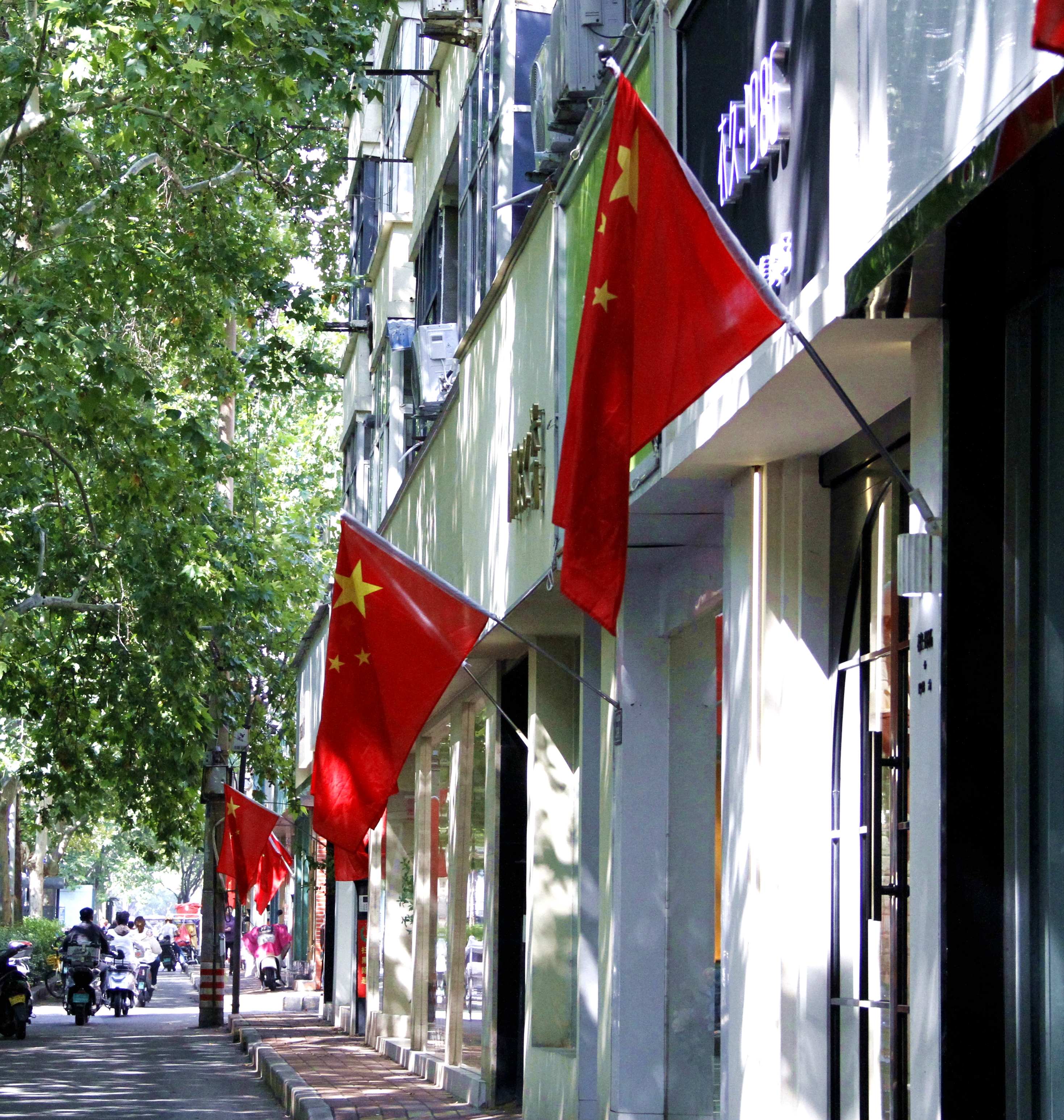 沿街门店纷纷在门前悬挂国旗,成为街区一道亮丽的风景线。