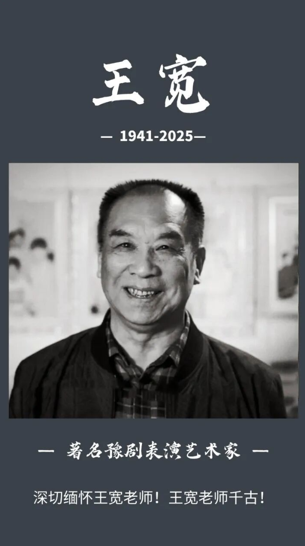 中国共产党党员、一级演员、著名豫剧表演艺术家、原郑州市豫剧团副团长王宽同志,因病医治无效,于2025年10月3日10时20分在郑州逝世,享年85岁。主演《三哭殿》《生死牌》《辕门斩子》等经典剧目,曾入选《感动中国》年度人物。