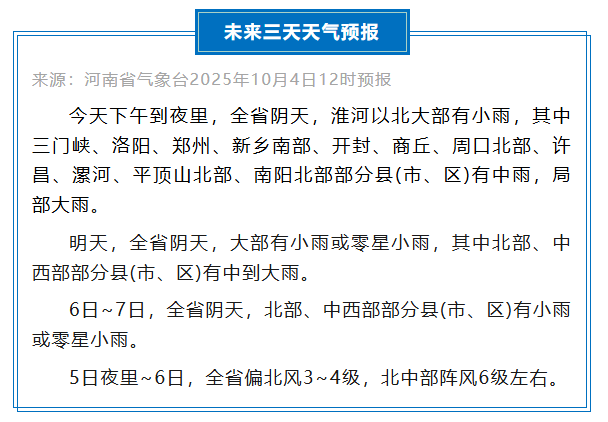 据河南气象,预计今明两天全省阴雨持续,中西部、东部、北部有中到大雨。受冷空气影响,5日夜里~6日,全省偏北风3~4级,北中部阵风6级左右。在降雨和大风的双重影响下,预计6日北中部部分地区最高气温将降至15℃左右,寒凉在线,大家注意及时增减衣物,谨防感冒。