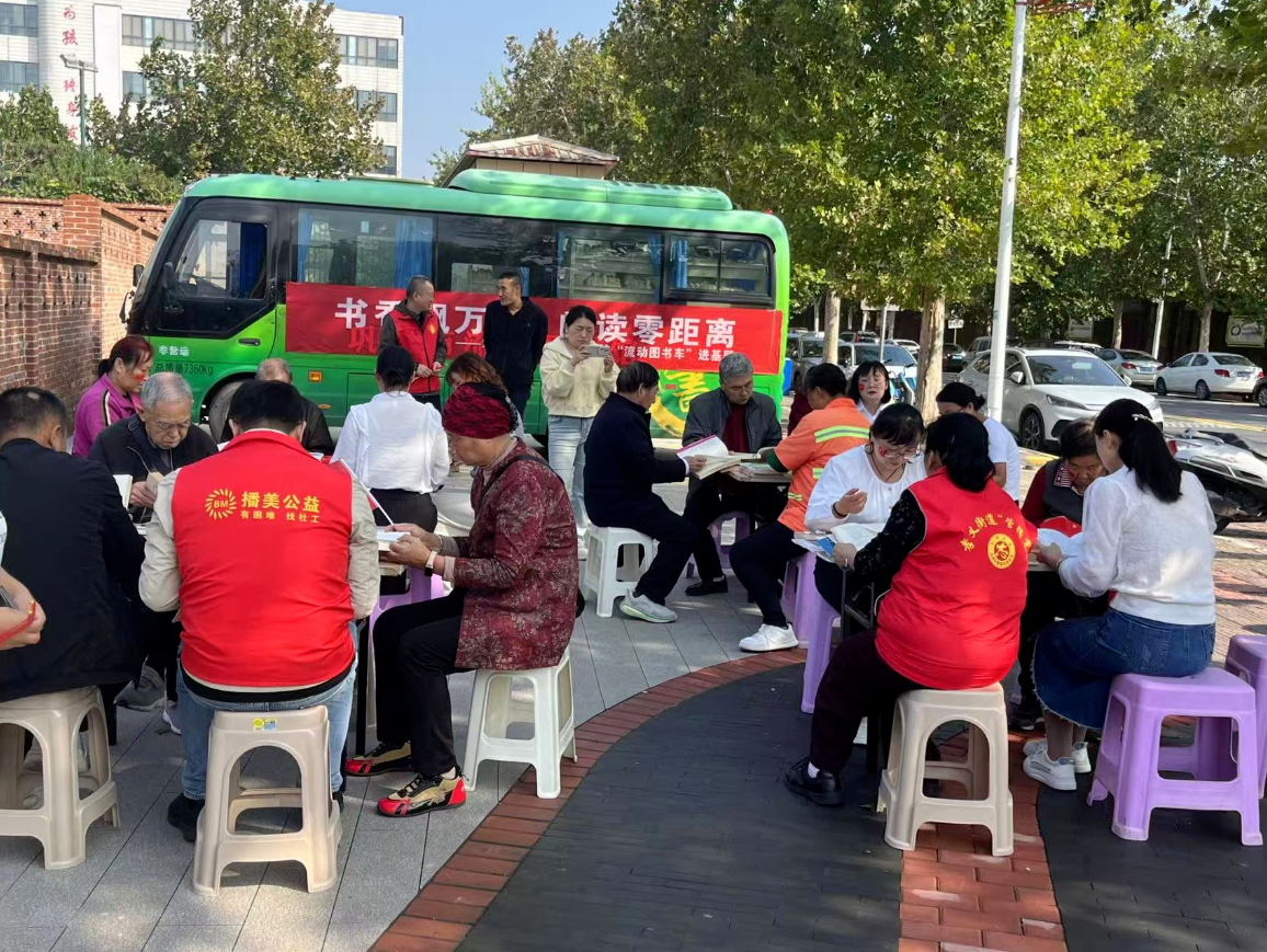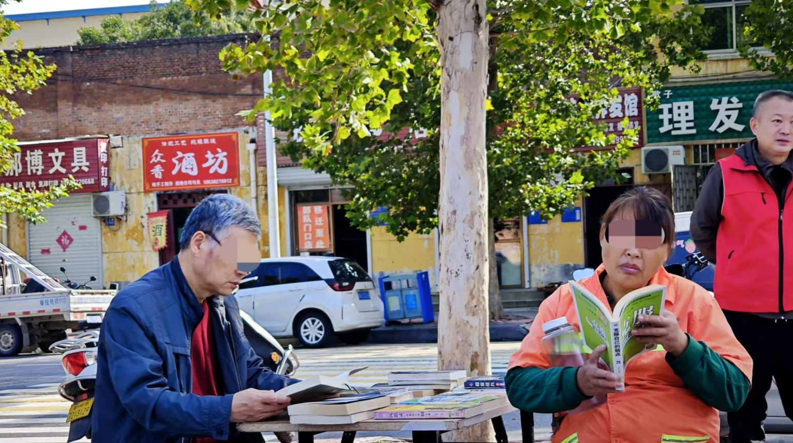 不远处,环卫工人张师傅也趁着换班间隙凑了过来。他拿起一本《平凡的世界》,看得入了迷。“平时扫街累了,就想看看书放松一下。过节还能参加活动,心里特别暖。”