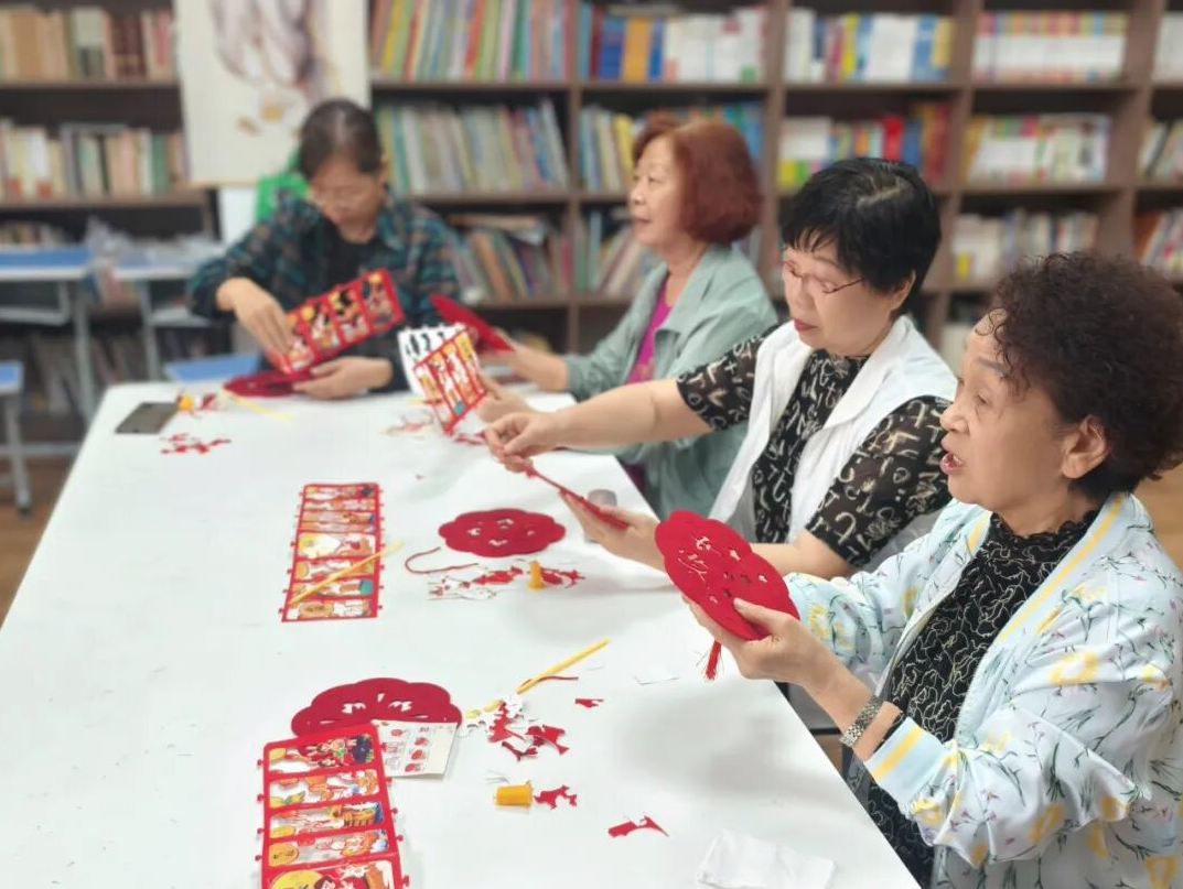 不远处,65岁的张爷爷正对着一堆材料发愁。他拿起灯笼底片,却怎么也找不到对应的粘贴位置。王奶奶看在眼里,主动走过去:“老张,我教你。”