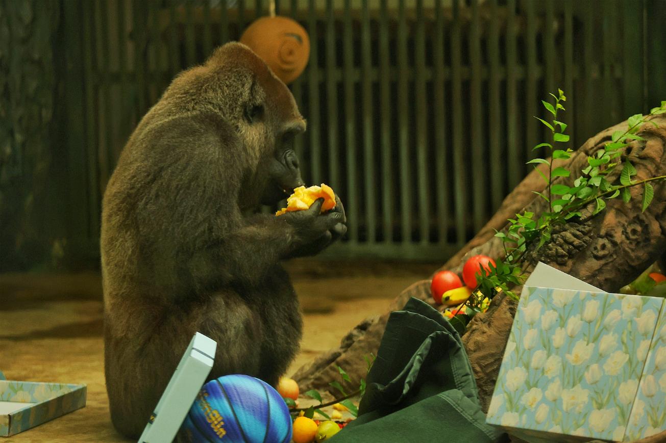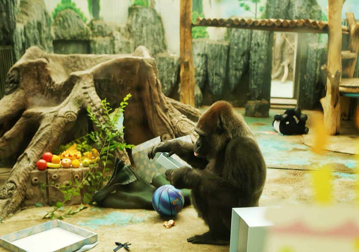 尼寇进到房间就被现场的气氛吸引了,但它毕竟是见过世面的“大明猩”,先淡定地剥个鸡蛋边吃边欣赏,然后走到礼物盒跟前,好奇地观察了一会儿,小心翼翼地逐一打开礼物盒,并饶有兴趣地玩起了礼物盒。此时,工作人员送了有草莓、蓝莓、凤梨等水果的特制生日蛋糕,场馆里响起生日歌,大朋友、小朋友们都不约而同为尼寇唱起“祝你生日快乐……”尼寇先是静静盯着蛋糕仔细打量片刻,又闻了又闻,再伸出舌头舔了一下,随后开始大快朵颐。