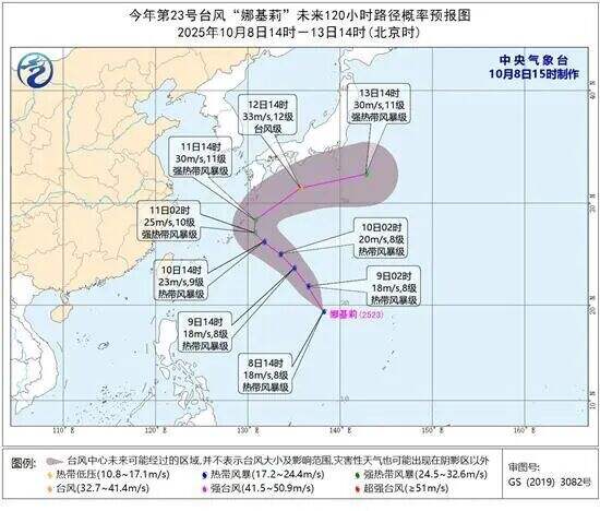 据中央气象台消息,今天下午,今年第23号台风“娜基莉”生成。今天下午14时,“娜基莉”的中心距离琉球群岛那霸市东偏南方向约1320公里,就是北纬19.3度、东经138.2度,中心附近最大风力有8级(18米/秒),中心最低气压为1002百帕。预计,“娜基莉”将以每小时25-30公里的速度向北偏西方向移动,强度缓慢增强。
