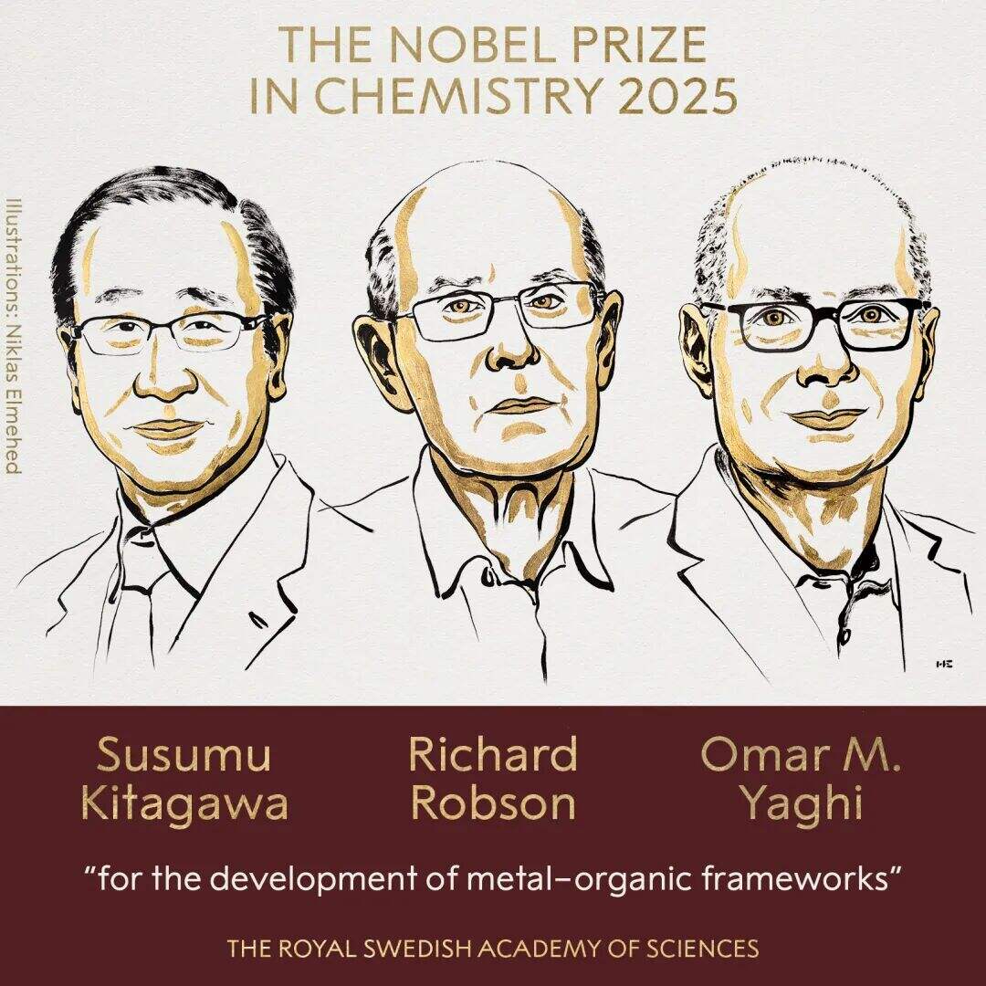 瑞典皇家科学院8日宣布,将2025年诺贝尔化学奖授予北川进、理查德·罗布森和奥马尔·M·亚吉,以表彰其“在金属有机骨架领域的贡献”。