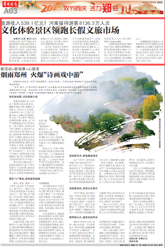 2025年国庆中秋“双节”叠加,8天超长假期为河南文旅市场注入强劲活力。全省文化和旅游系统针对节日特点,丰富市场供给,推动我省继暑期文旅市场之后再迎小高峰。假日期间,受大部分地区大部分时段连续降雨影响,全省接待游客8136.3万人次、旅游收入539.1亿元,按可比口径计算,分别为去年同期的89.1%、83.4%。