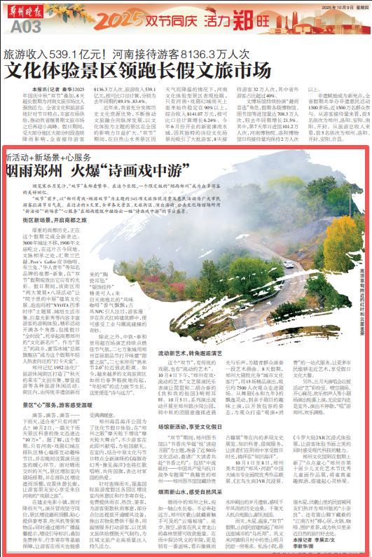 “双节”前夕,以“郑州有戏·畅游双节”为主题的345项文旅体促消费及惠民活动为广大市民游客拉满节日气氛。在过去的8天里,全市各大景区、文旅街区、演出活动、公共文化场馆场所用“新活动”“新场景”“心服务”在烟雨朦胧中描绘出一幅“诗画戏中游”的节日盛景。